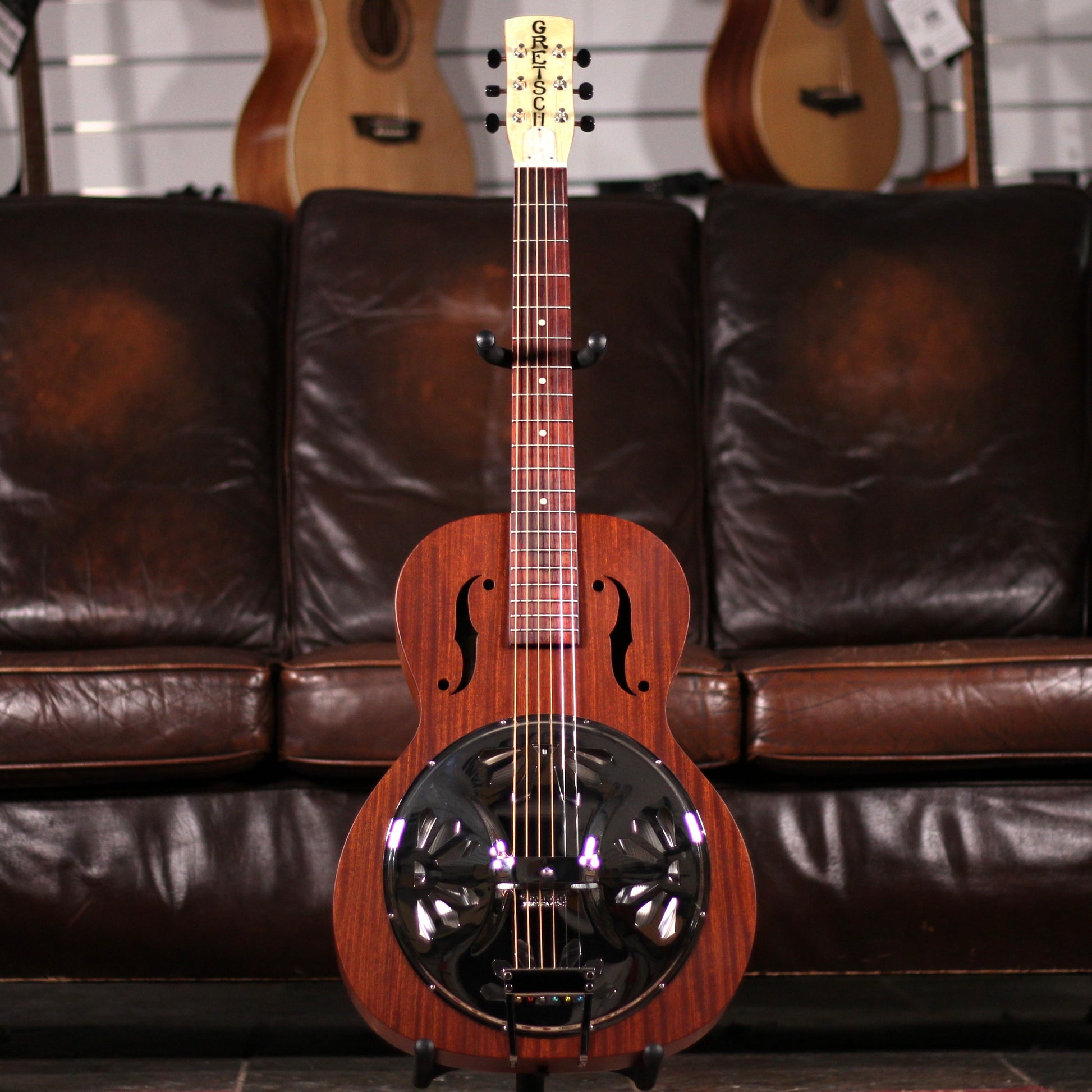 With its mahogany "long-body" design and comfortable "soft V"-shaped neck, this faithful reissue of the 1930s classic sounds and plays like a million bucks. The vital feature of all Gretsch resonator guitars is the Gretsch Ampli-Sonic™ diaphragm (resonator cone), which is hand-spun in Eastern Europe from nearly 99 percent pure aluminum, yielding an impressive quality and volume of tone.