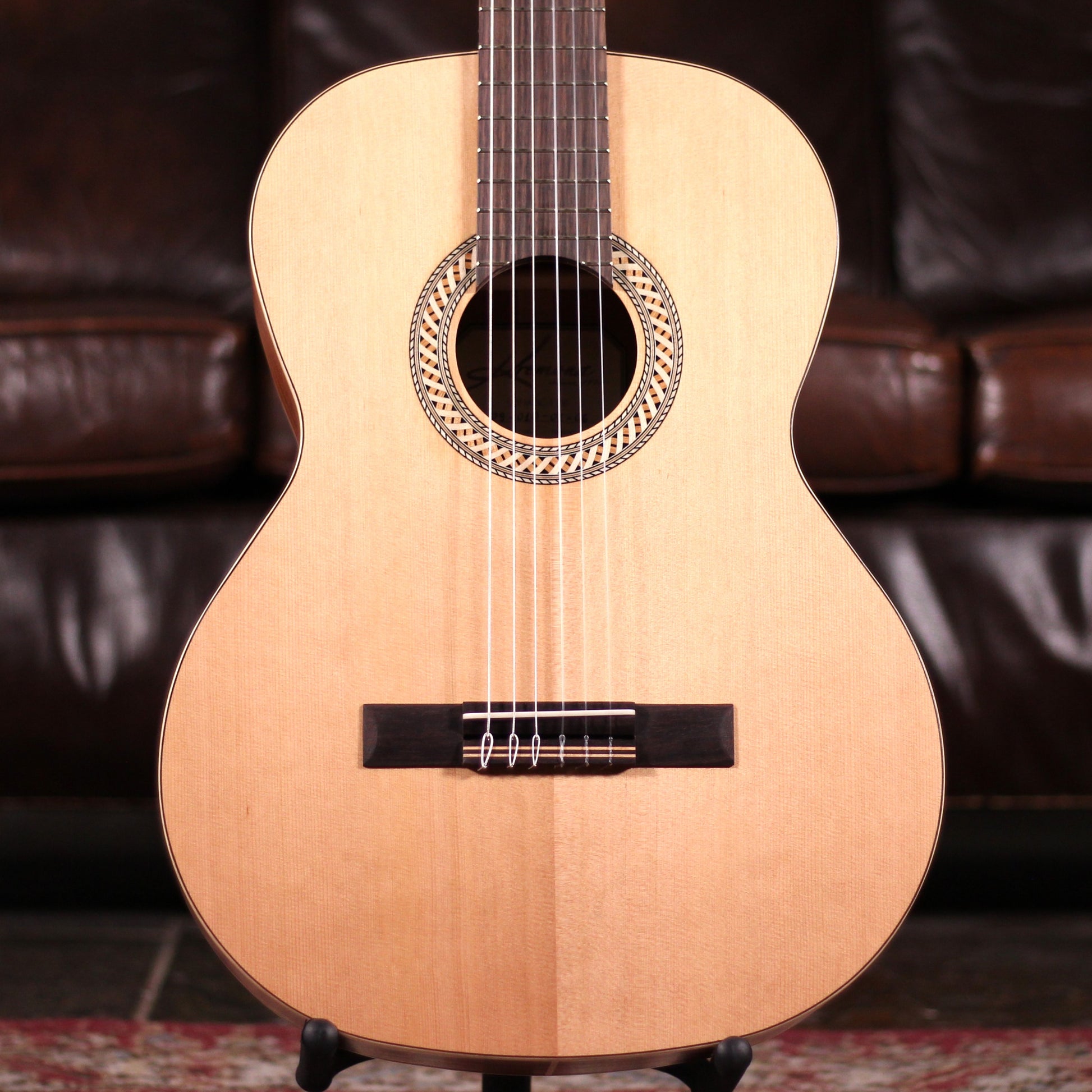 "An American red cedar top with warmth and articulation is paired with sustainable West African sapele for a vibrant and balanced sound in Sofia. Edged in birch with fine rosewood purfling, this handcrafted instrument of all-solid wood offers an appearance as beautiful as its sound."